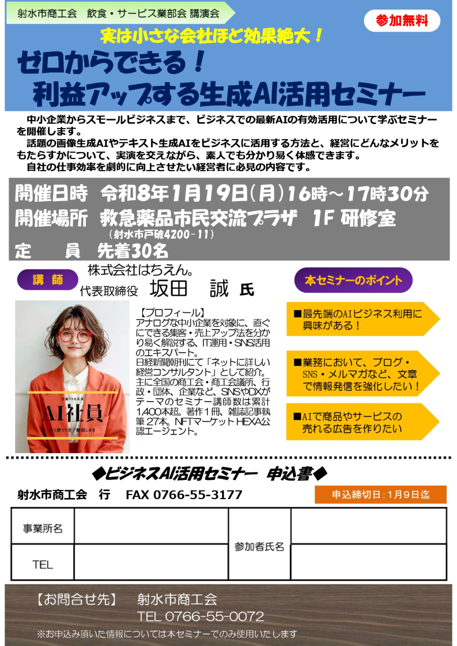 射水市商工会飲食・サービス業部会の講演会として、 ビジネスにおける最新AIの有効活用について学ぶセミナーを開催いたします。